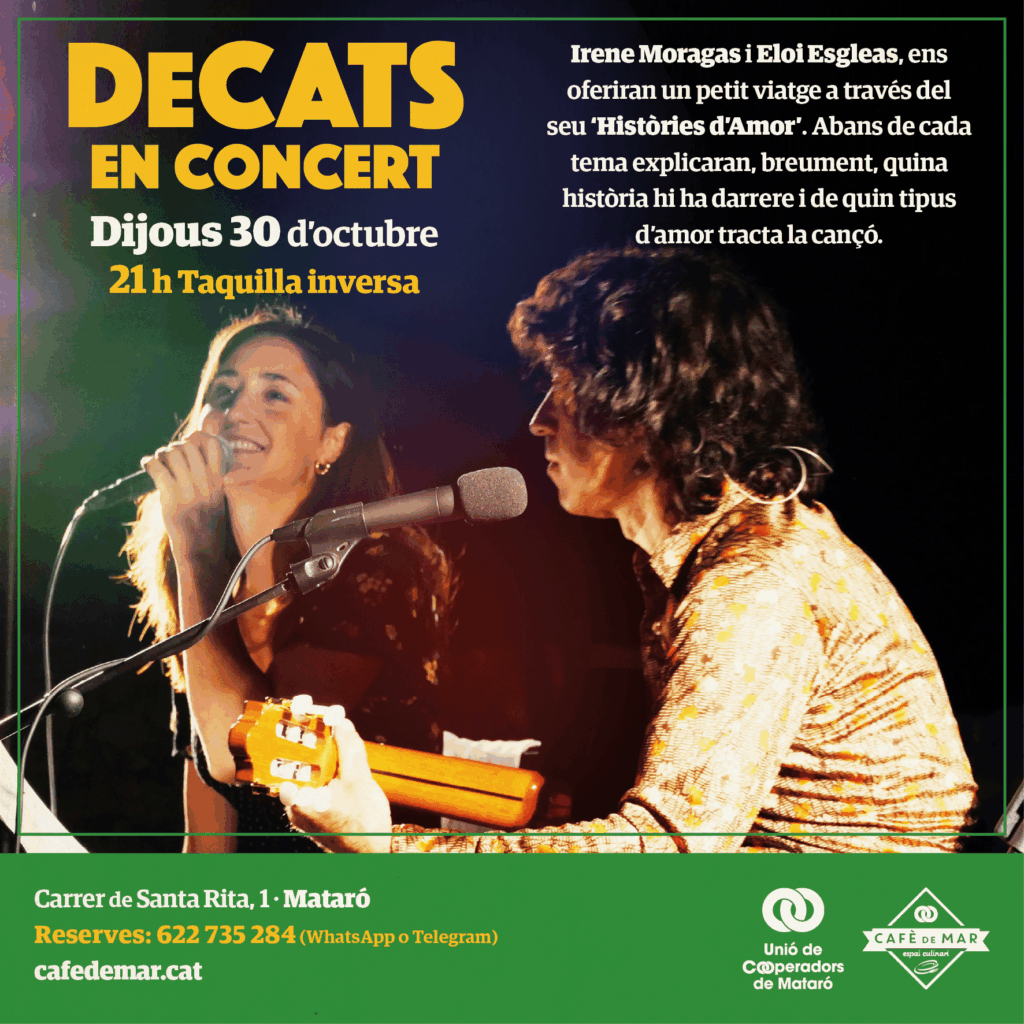 DeCATS, amb Irene Moragas i Eloi Esgleas, ens oferiran un petit viatge a través del seu ‘Històries d’Amor’. L’amor és un tema molt recurrent a les lletres de les cançons, cada cançó que interpretaran explica una història bonica. Aquí és on entren la Irene i l’Eloi, explicaran breument, abans de cada tema, quina història hi ha darrere i de quin tipus d’amor tracta la cançó.