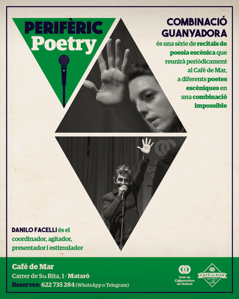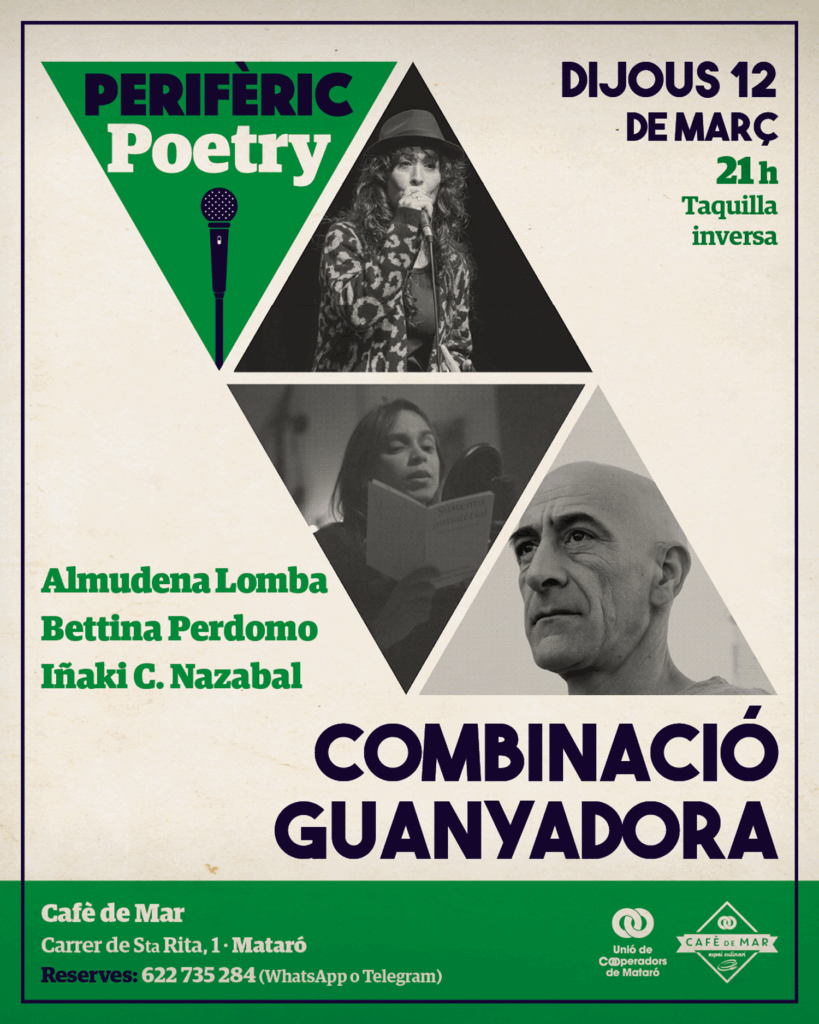 Combinació Guanyadora és una sèrie de recitals de poesia escènica que reunirà periòdicament a l’Espai Culinari del Cafè de Mar, a diferents poetes escèniques en una combinació impossible. Aquesta primera edició comptarà amb tres de les veus més interessants del panorama actual: Almudena Lomba, Bettina Perdomo i Iñalki C. Nazabal. Com havia de ser, Danilo Facelli és el coordinador, agitador, presentador i estimulador del Perifèric Poetry.